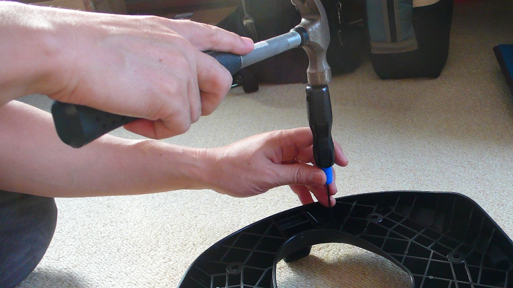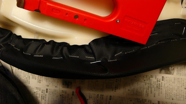 タッカーでシート表皮を止めるのですが、タッカーが入らないところもあり、針が中途半端な状態で刺さってしまい、これをキチンとシートの土台に差し込まねばなりません。