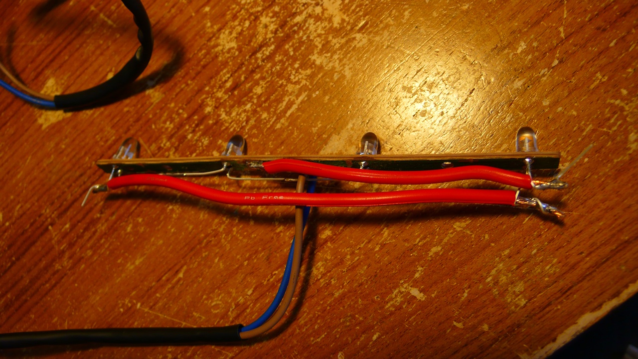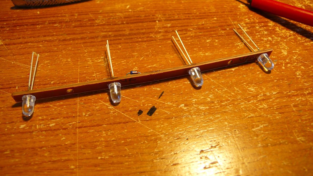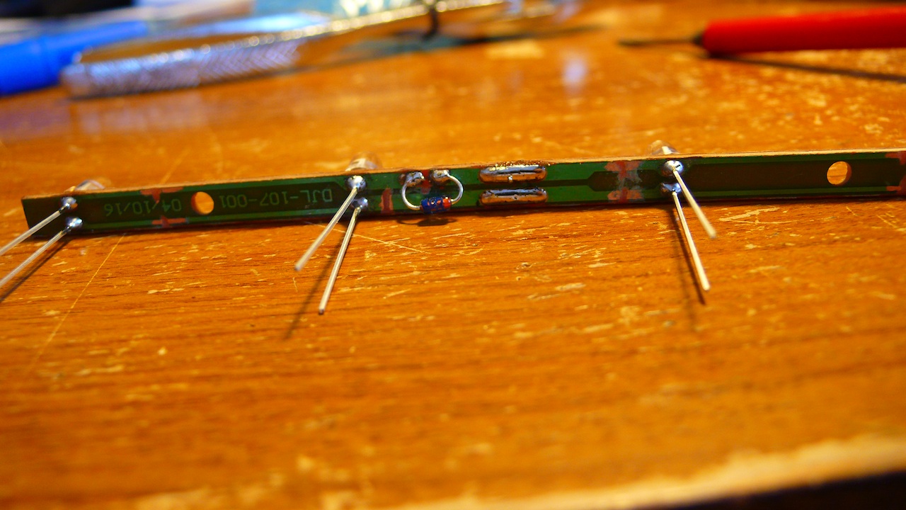 ムギ球が付いていた基板を元に、LEDをハンダ付けします。麦球は並列に4個接続されていたので、裏側のプリント配線をぶった斬り、直列に接続できるようにしておきます。