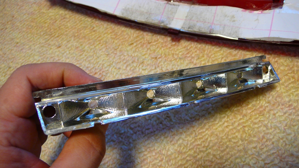 ストップランプのハウジングです。ムギ球が4つ入るリフレクタがモールドされています。