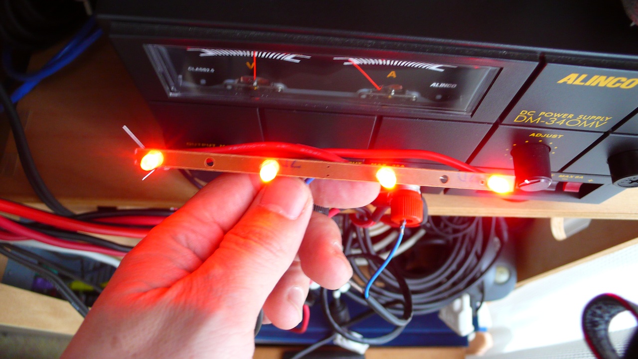 極性の間違いが無いか、半田不良は無いかを確認して、12Vに接続。おおー無事点灯。