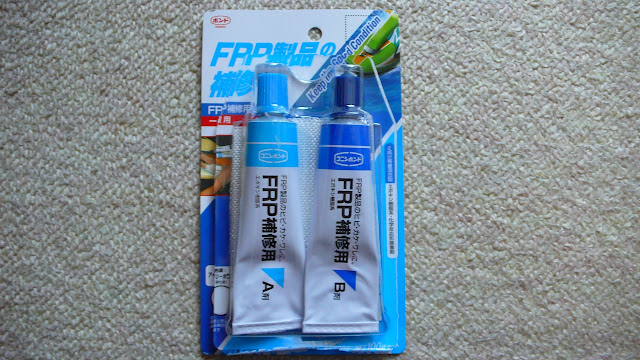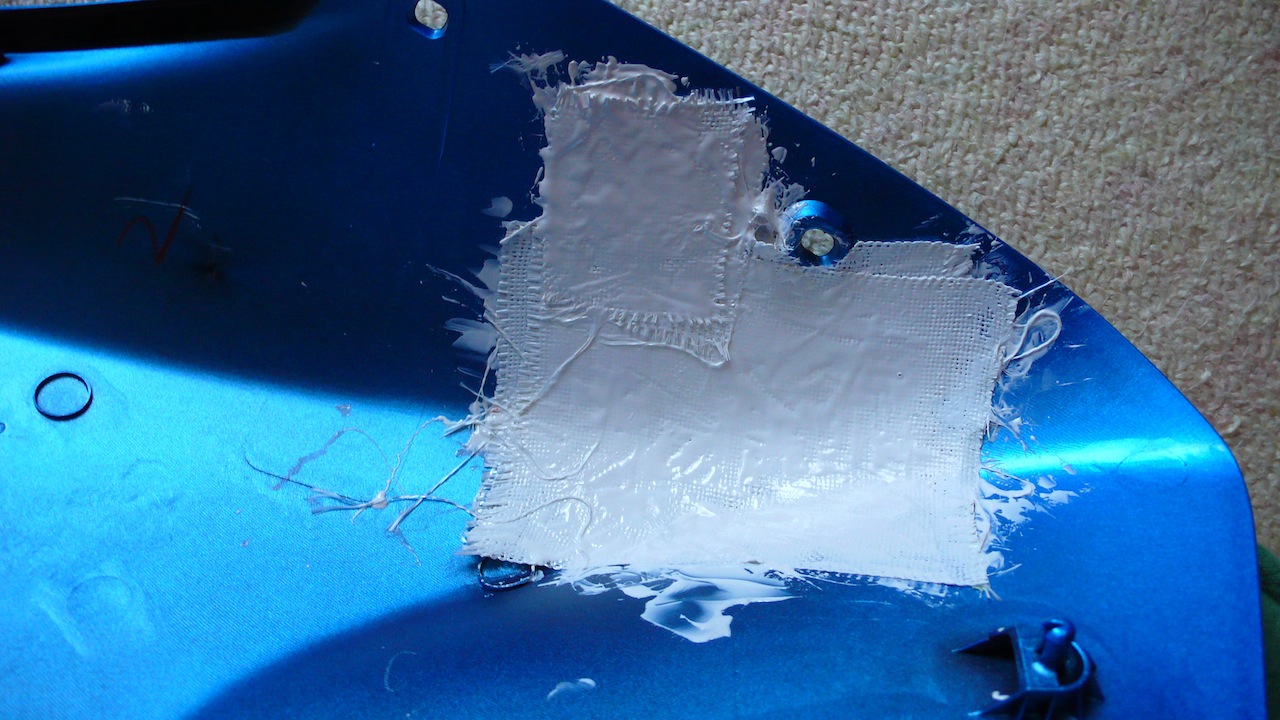 この接着剤は、エポキシの2液混合タイプですが、もう一つ、ガラス繊維が付属しています。このガラス繊維をひび割れ部分に当てながら、混合したエポキシ剤をヘラで塗っていきます。1枚貼りつけた後、もう一枚重ねて、さらにエポキシ剤を塗っていきます。